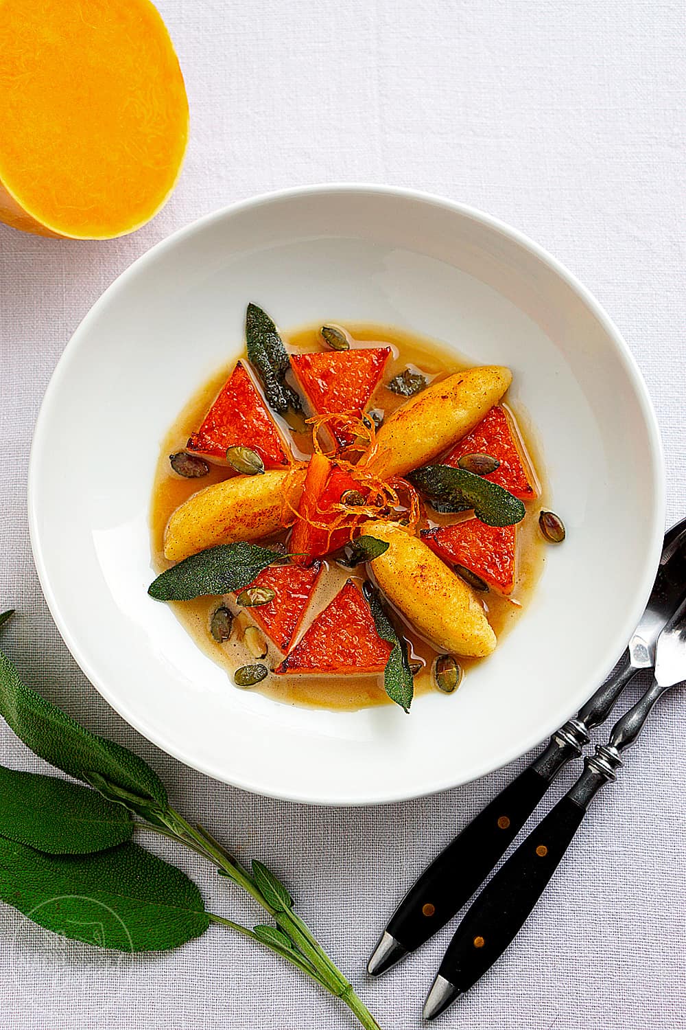Kürbis im Salbei-Jus mit Grießnocken nach Johannes King ist ein wundervoll aromatisches, vegetarisches Gericht für alle Anlässe.