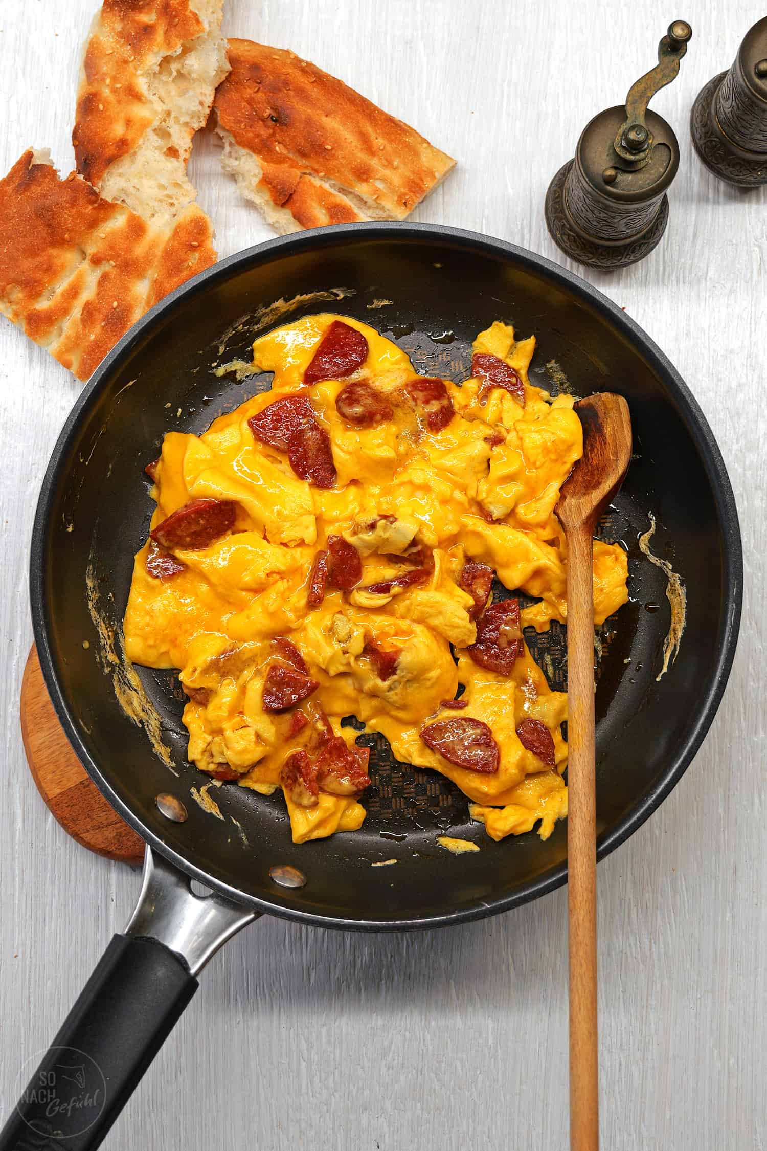 - So weit stocken lassen, wie du es magst – wir bevorzugen unser Rührei noch leicht feucht und nicht zu trocken. Aber da ist jeder anders.