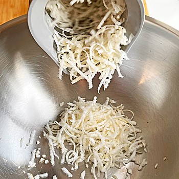 - Rote Bete schälen und ebenfalls fein reiben, aber separat aufbewahren.