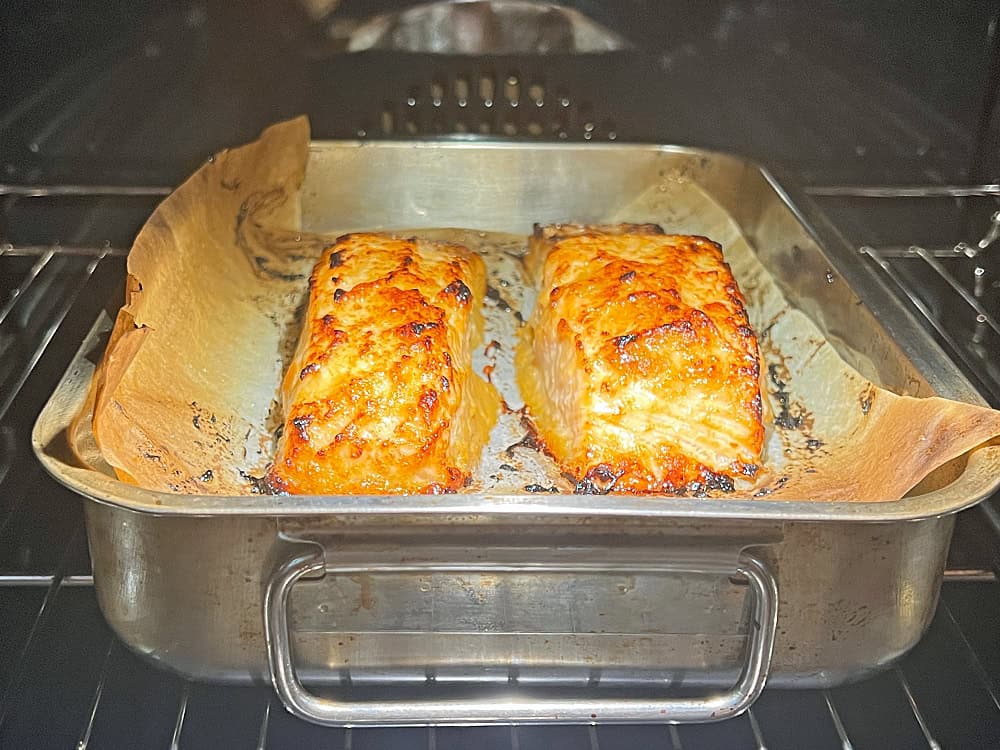 - Das Backpapier mit den Lachsfilets auf einem Blech auf der obersten Schiene unter den heißen Grill schieben. Für 14 Minuten durchgaren und gratinieren. Dunkle Stellen sind gewünscht und geben mehr Geschmack!