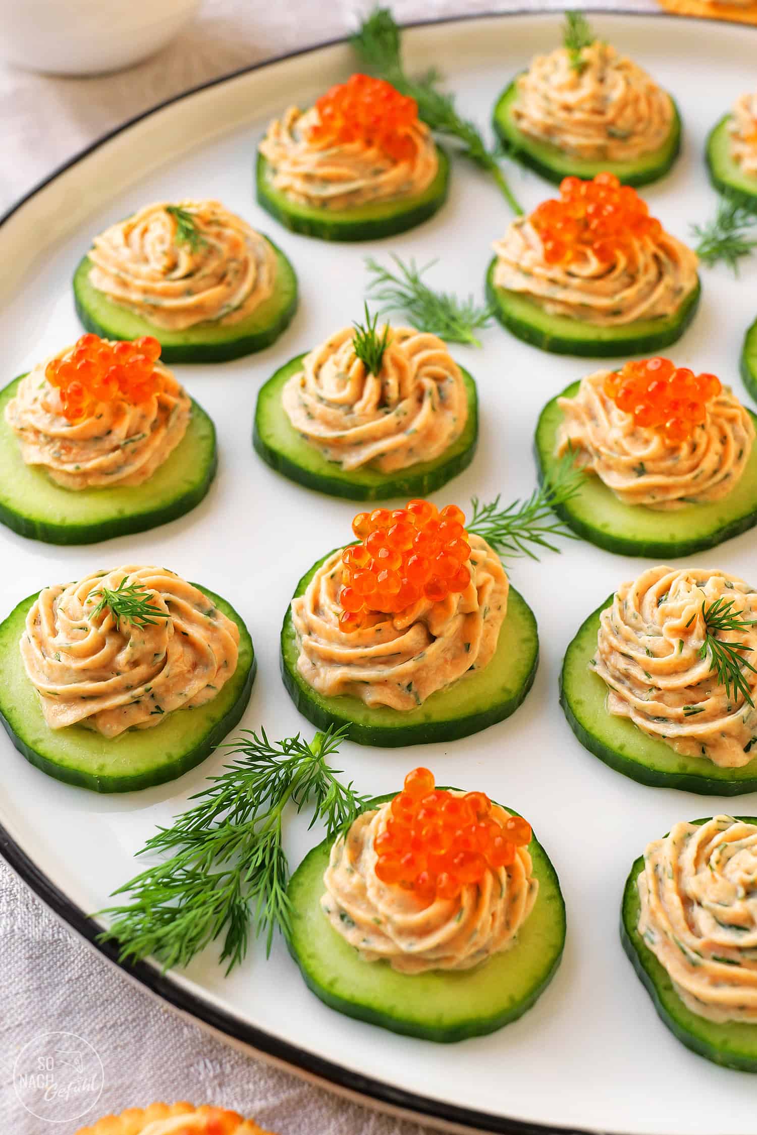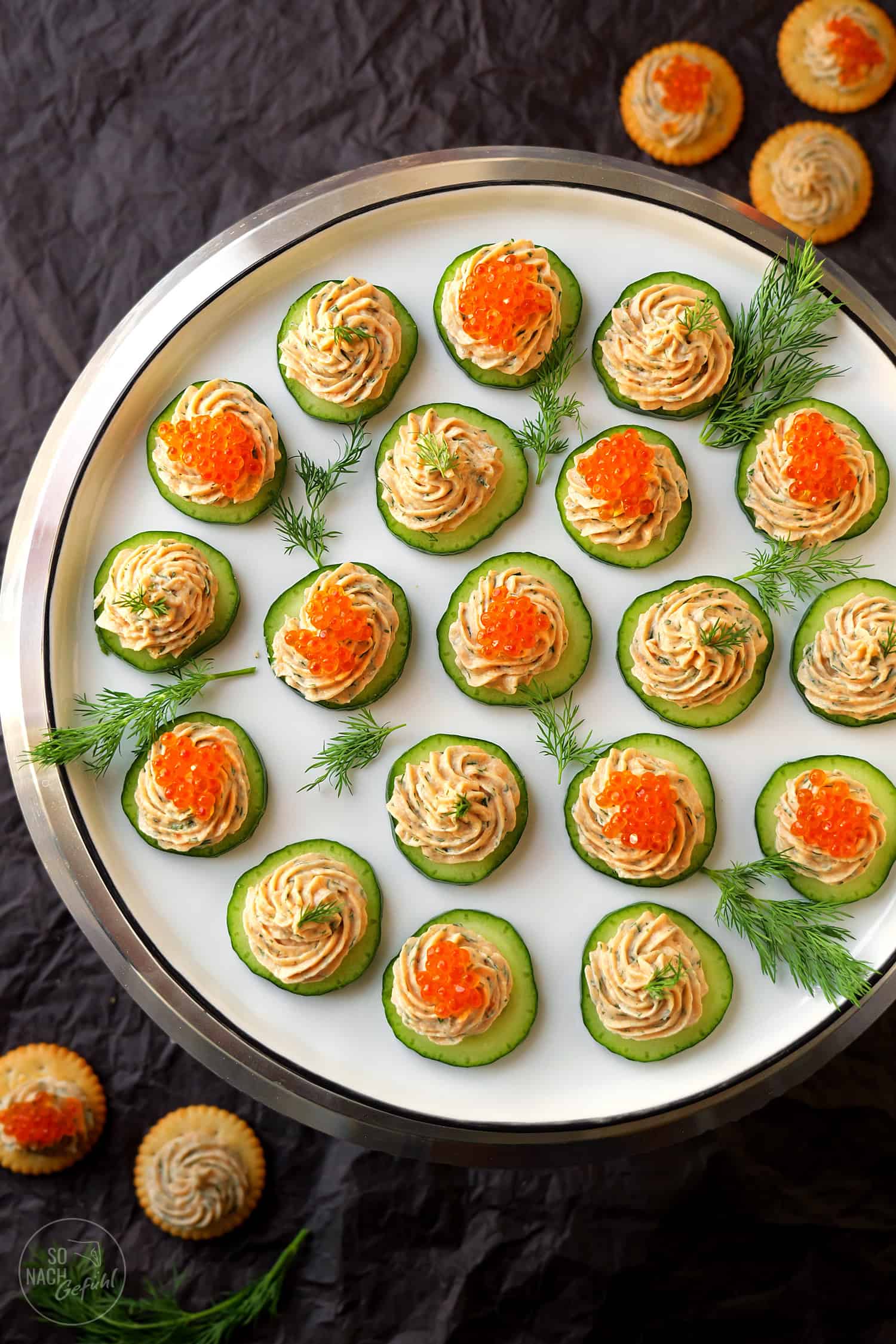 - Lachscreme mit Hilfe des Spitzbeutels auf die Gurkenscheiben spritzen. Wahlweise gehen natürlich auch Pumpernickel, Club-Kräcker, geröstetes Baguette o.ä.