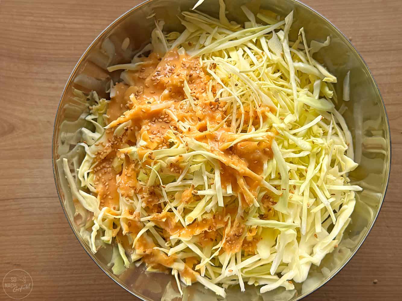- Den gehobelten Spitzkohl in einer Schüssel mit dem Dressing und der Hälfte des gerösteten Sesams gut verkneten. Am besten trägt man dabei Einweghandschuhe.